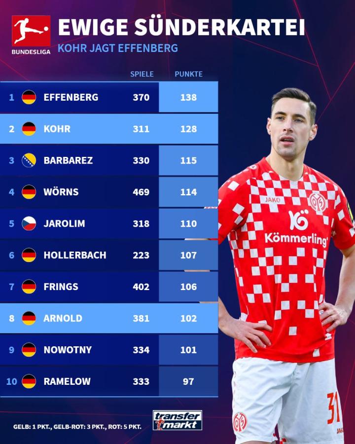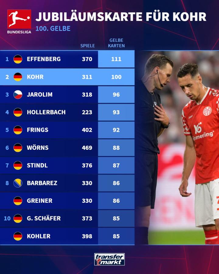 根据德甲官方数据统计,这已是科尔在德甲生涯中领到的第100张黄牌,他也因此成为德甲历史上第二位黄牌数超过百张的球员。在此之前,唯一达成这一成就的是拜仁慕尼黑传奇球星“老虎”埃芬博格,这位拜仁名宿在370场德甲比赛中累计领到111张黄牌。